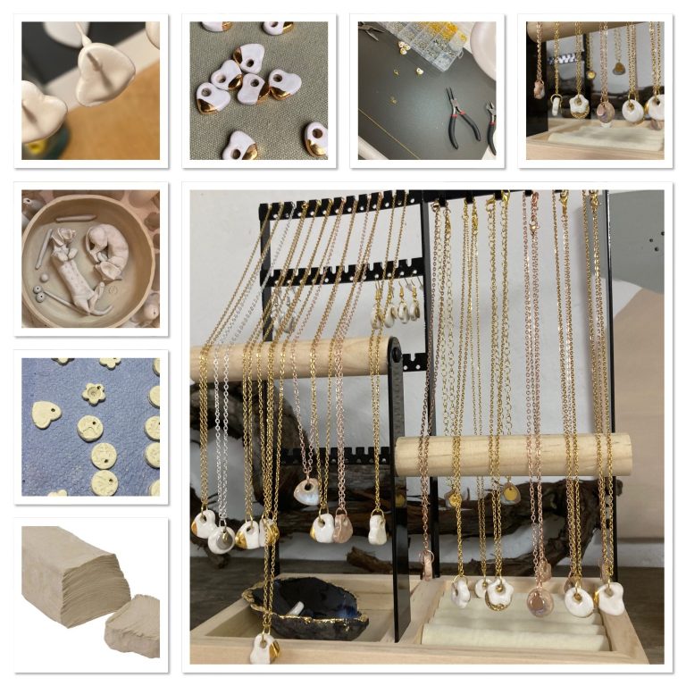 Ich biete kreative individuelle Geschenkideen wie Schmuck und Gegenstände aus Ton für zu Hause, die unser Heim schöner machen.
